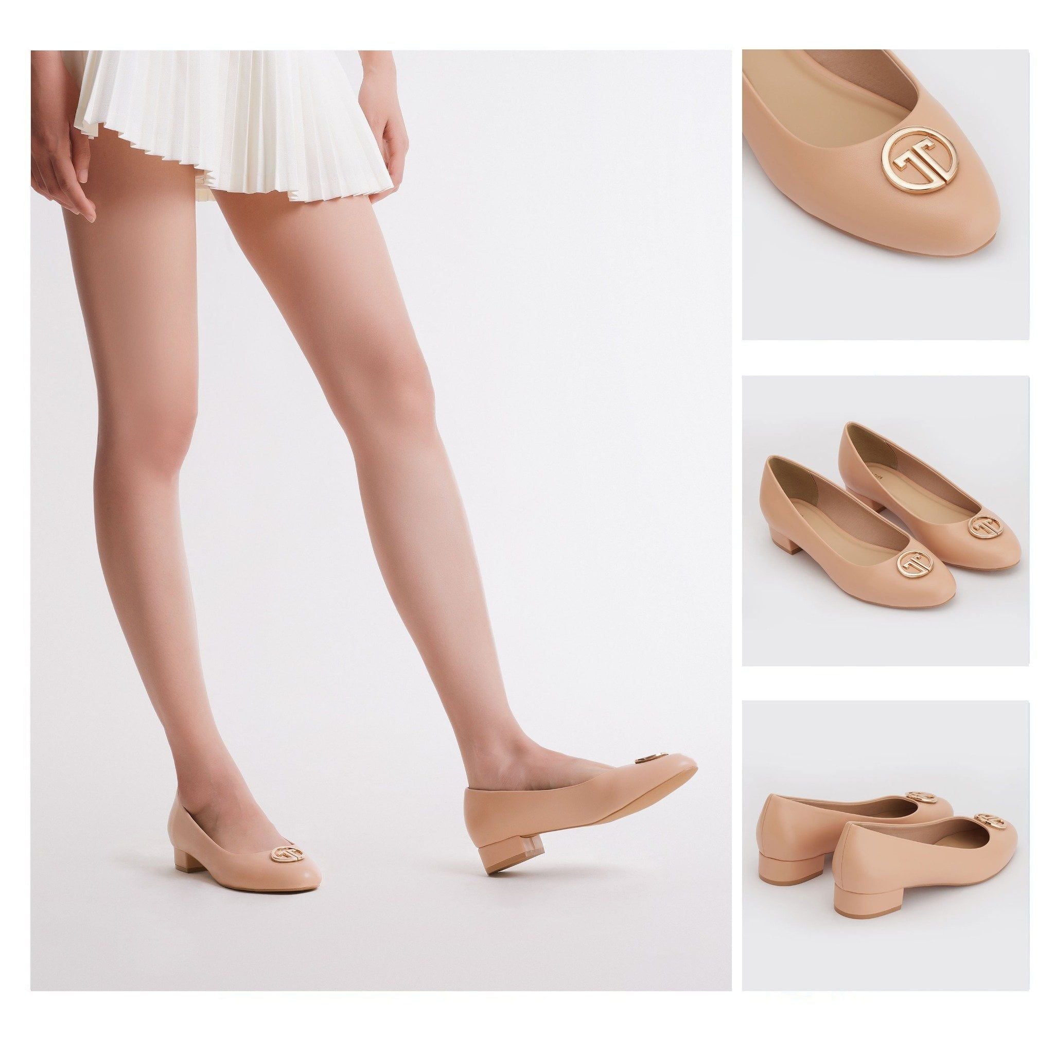 Giày Búp Bê Nữ THÁI TUẤN Mũi Bầu Phối Logo Trang Trí Màu Kem